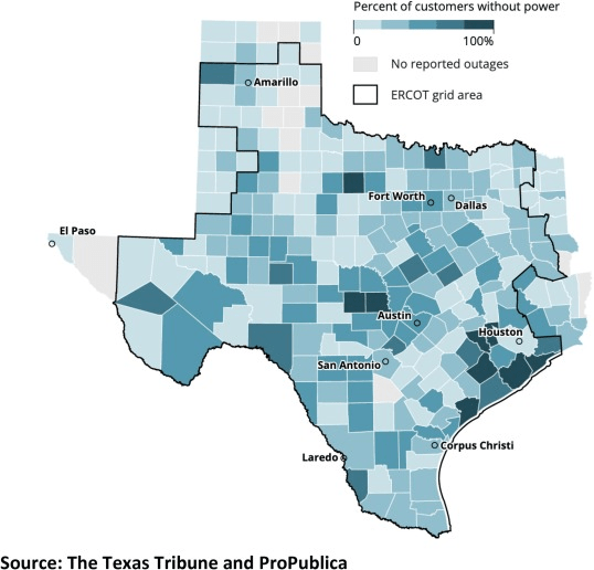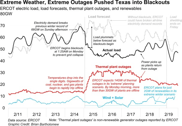 The extreme cold caused a number of coal, gas, and even a nuclear plant, to trip offline. This rapidly cut the power available to the grid. In response to this loss, grid operators began dropping sections of the grid. This reduces demand to within the available supply. (Wind and solar actually did fairly well. They were projected to only supply 2,000 MW, but often supplied much more. Unfortunately when the worst of the event was occurring, they were also at their lowest output.)