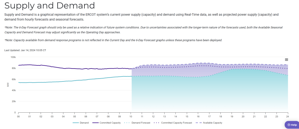 The above graph is the current supply and demand profile for ERCOT. ERCOT runs the grid in Texas. The solid lines are actual data, the dashed lines are projections for future supply and demand.