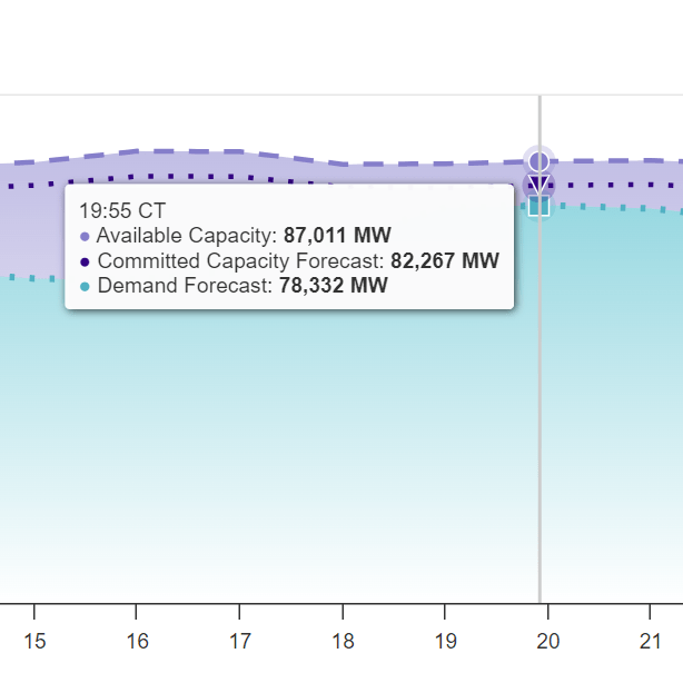 Zooming in on the section where conditions are expected to be the worst, we can see that demand is projected to reach 78,332 MW and available capacity is expected to be 87,011 MW. This means that ERCOT expects there to be enough power on the grid to meet the expected demand.