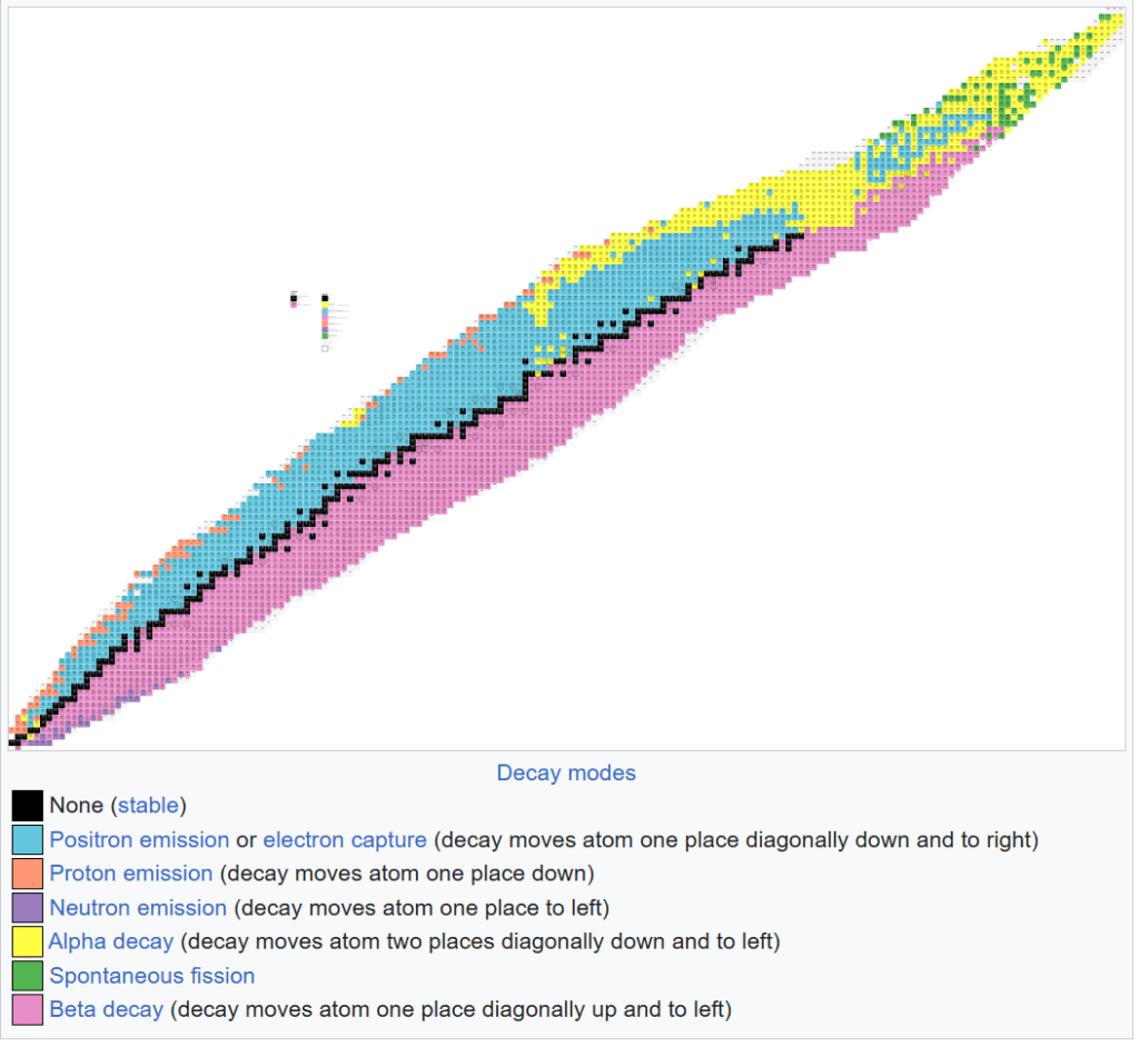 The table below shows this concept visually. The x-axis (horizontal) is the number of neutrons and the y-axis (vertical) is the number of protons. The black squares are stable isotopes and we refer to the line they make through this graph as the line of stability. The other colors are unstable and show the type of radiation that each unstable isotope is likely to experience.