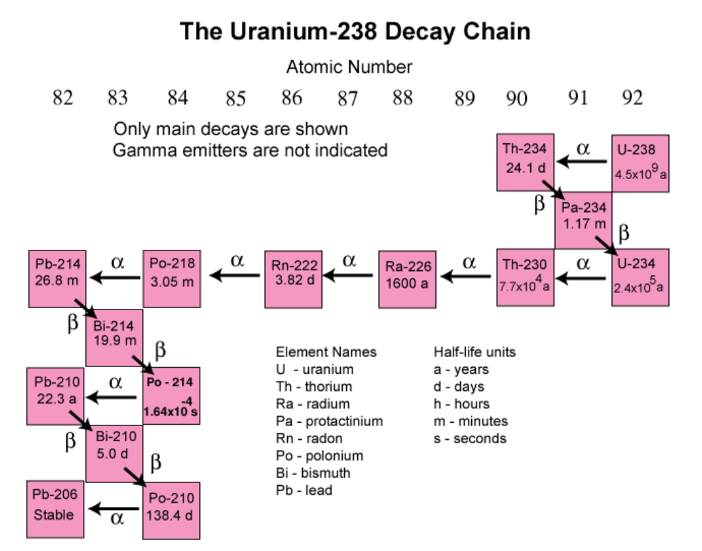 Each kind of radiation that is emitted causes a different change in the atom that is trying to become stable. We will follow U-238 as it is such a relevant isotope for this discussion. We refer to this process as the decay chain for a specific isotope. Below we see the decay chain for U-238.